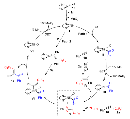 根据以上实验结果,作者提出了一种可能的机理:首先,将酰氯3a氧化加成到通过Mn还原原位生成的Ni(0)物种I,得到(酰基)Ni(II)-X物种II,然后在Mn存在下进行单电子还原生成(酰基)Ni(I)中间体III。同时,Ni(0)或Ni(I)物质介导C4F9I与炔烃的自由基加成和随后的碘原子转移,得到E-烯基碘化物IV。随后,中间体III和中间体IV之间的单电子转移提供(酰基)Ni(II)物种II和烯基自由基V。或者,发生全氟烷基自由基与炔烃的自由基加成,然后拦截Ni(II)物种II得到Ni(III)物种VI。最后,中间体VI参与还原消除生成产物4a和Ni(I)物种VII,后者被Mn还原为Ni(0)(路径1)。然而,乙烯基镍物种VIII与酰氯的直接氧化加成的途径也是可能的(途径2)。