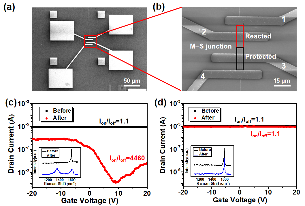 图3. (a, b) 单根的单壁碳纳米管FET器件的SEM图像。(c, d) 在Vds = 1 V时,1-2和3-4源漏电极的Ids-Vg曲线。插图是1-2和3-4源漏电极沟道内单壁碳纳米管的拉曼光谱。