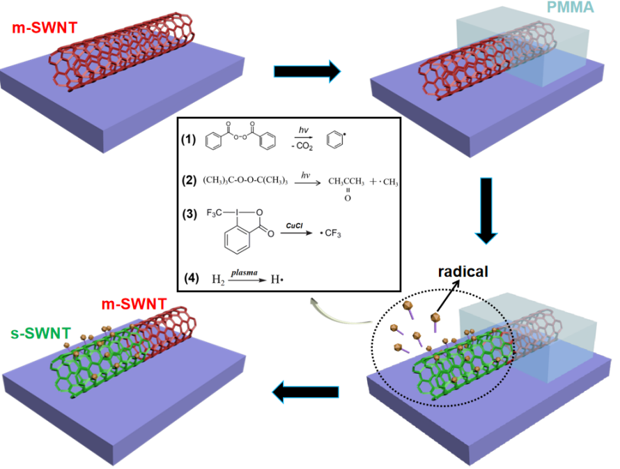 图1. 选区自由基反应制备单壁碳纳米管肖特基结的示意图。