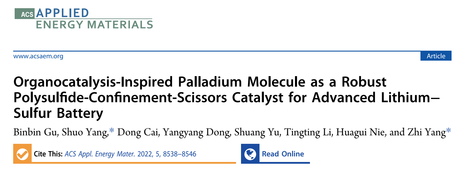 相关研究成果以《Organocatalysis-Inspired Palladium Molecule as a Robust Polysulfide-Confinement-Scissors Catalyst for Advanced Lithium–Sulfur Battery》为题发表在《ACS Applied Energy Materials》杂志上(https://doi.org/10.1021/acsaem.2c01078)。杨植教授、青年教师杨硕博士为通讯作者,永利硕士研究生谷斌斌为第一作者,聂华贵教授、蔡冬博士、研究生东洋洋、于爽、李婷婷等人参与此项工作。相关工作受到国家自然科学基金项目(22109119, 51972238, 22105147,21875166),浙江省自然科学基金项目(LR18E020001,LQ22B030003),温州市重大科技创新攻关项目(ZG2021013)以及温州市一般科研项目(G2020002,H20210006)的支持。
