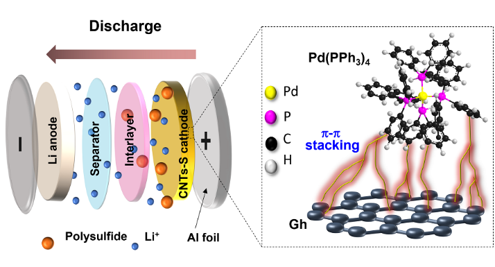 有机金属钯分子因在众多工业合成中都表现出超高的催化活性,从而引起了人们的注意。近期永利杨植教授团队开发了一种四(三苯基膦)钯(TPP)催化剂修饰石墨烯(Gh)的插层膜,应用于Li−S电池正极结构中。结合原位光谱、电化学表征和理论计算研究发现,在Li−S电池体系中,三苯基膦的解离打开了TPP 的盖子,为吸附/催化长链和短链多硫化锂提供了足够的空间和催化活性位点。此外,TPP中存在大量亲锂的P原子,可通过P−Li键促进Li+的传输。由于这种协同效应,含有Gh/TPP的锂硫正极在4.43 mg cm−2的高硫负载条件下,仍显示出优异的循环稳定性(在0.1 C下循环180 圈容量保持率为83.7%,面积容量为2.44 mAh cm−2)。这项工作架起了有机催化和电化学之间的桥梁。