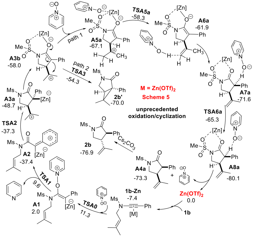根据以上实验结果并结合理论计算研究(南京农业大学邓超副教授合作),作者提出了一种可能的机理:首先炔酰胺被金属催化剂三氟甲烷磺酸锌活化,炔酰胺受分子间氮氧氧化生成烯基金属中间体A1;紧接着,苯环上的π电子反馈回来,促进了分子内的类烯醇互变反应得到酰胺金属中间体A2;随后,该中间体被分子内的烯烃捕获生成异丙基正离子中间体A3a;最后发生金属迁移/烯醇互变/氢消除反应,得到顺反两种构型的 γ-内酰胺化合物,此时,再添加碳酸铯搅拌2 h后可使产物转化为热力学稳定的反式构型 γ-内酰胺化合物。