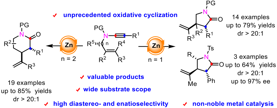 近日,永利钱鹏程-李龙教授课题组实现了烯烃取代内酰胺的高效、多样性合成。该方法研究了在锌催化剂作用下,烯炔酰胺化合物的分子间氧化环化反应。这种廉价金属催化的氧化环化反应具有高产率和优异的区域选择性、立体选择性等优点。