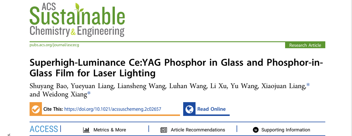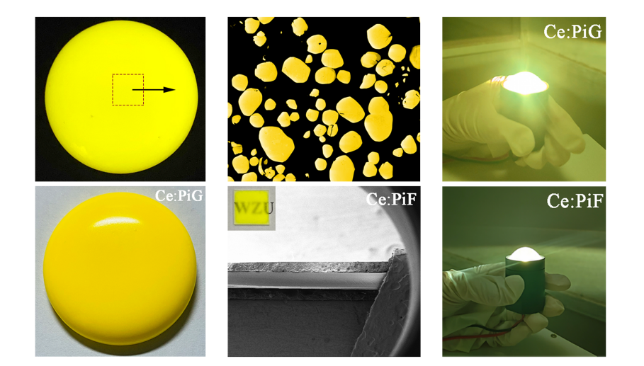 固态激光照明因其体积小、效率高、亮度大,在照明应用中发挥着重要的作用。目前,人们将蓝色LD芯片用来激发黄色荧光粉,通过蓝光和黄光结合形成白光。然而由于蓝光芯片可以在高激发功率密度下快速达到高温,有机树脂较低的热导率(0.1-0.4 W m-1K-1),较差的热稳定性和化学稳定性导致它并不是蓝色LD应用的理想色彩转换器。幸运的是,当把荧光粉均匀地分散到玻璃基体中,然后在低温烧结时,荧光玻璃(PiG)表现出了很高的化学稳定性和热稳定性。它不仅可以与各种荧光粉结合,实现全光谱照明,还可以通过调节荧光粉的浓度和样品的厚度,发出白光。因此,PiG已经成为最常用的色彩转换材料。此外,由于蓝宝石具有较高的热导率,PiGF通过在蓝宝石衬底上印刷PiG来增强耐热性。荧光玻璃蓝宝石薄膜具有较高的光效和激光饱和阈值,这使其成为激光照明领域下一个有前途的候选者。