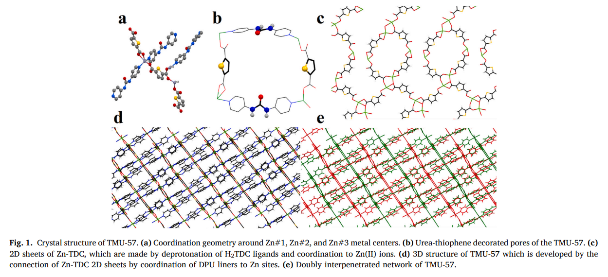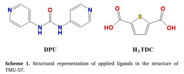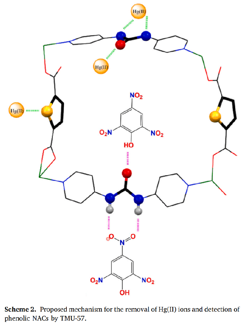 为了解决以上两大难题,本课题合成了一种新型3D MOF材料TMU-57(分子式为[Zn(TDC) (DPU)].0.85DMF,H2TDC为噻吩-2,5-二羧酸,DPU为1,3-二吡啶-4-脲),实现了对汞离子的强吸附及对酚类硝基芳香化合物的灵敏检测。