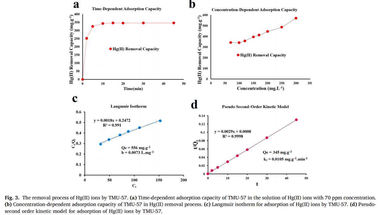并且,TMU-57对Hg(II)显示出强吸附能力,吸附容量达570 (14) mg.g−1,可以选择性去除水中Hg(II),TMU-57经过3次再生吸附容量没有没有明显降低。研究结果表明多功能化的策略能够拓展功能MOF材料作为有效的主体从单一应用走向多方面应用。