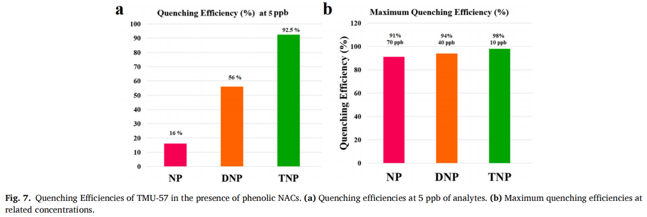 由于TMU-57经过富电子官能团噻吩和脲的修饰,它能够通过氢键以及路易斯酸-碱与不同的客体相互作用。TMU-57是对NACs最灵敏的传感器之一,特别是对2,4,6-三硝基苯酚(TNP),当TNP浓度为5 ppb时,对TNP的荧光淬灭率达92.5% (9),Ksv值为 2 (1) × 10+8 M−1,检测限达到9 × 10−9 M (k = 3, σ = 0.6),性能优于已报道的MOF材料。