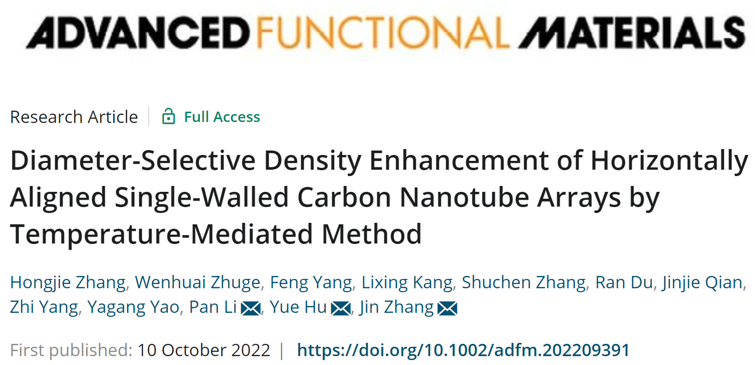 近日永利胡悦特聘教授团队联合南京邮电大学李盼副教授、北京大学张锦教授在控制制备高密度单壁碳纳米管(SWNT)方面取得新进展,开发了一种简单且新颖的温度扰动策略以制备具有管径选择性的高密度SWNT阵列,为SWNT在纳电子器件方面的提供了理想平台。相关成果以标题“Diameter-Selective Density Enhancement of Horizontally Aligned Single-Walled Carbon Nanotube Arrays by Temperature-Mediated Method”(DOI:10.1002/adfm.202209391)发表在Advanced Functional Materials。该工作通过调节温度对金属催化剂容碳量进行调控,再活化具有特定尺寸的因被碳包覆而失活的催化剂,使其继续催化生长特定管径的SWNT。最终使得在石英基底上获得的SWNT阵列的密度增加了三倍以上,且管径分布控制在2纳米左右。并通过环境透射电子显微镜对催化剂再活化过程进行原位研究,为催化剂效率的提高提供了关键性的见解。使用获得的SWNT阵列制作场效应晶体管器件,该器件表现出非常优秀的载流子迁移能力,表明所获得的SWNT阵列在纳电子器件中的应用潜力。相关文章发表在Advanced Functional Materials上,永利3044集团官网为第一通讯单位,永利2019级研究生张红杰为第一作者,永利胡悦特聘教授、南京邮电大学李盼副教授及北京大学张锦教授为共同通讯作者。相关工作受到国家自然科学基金和浙江省自然科学基金项目的资助。