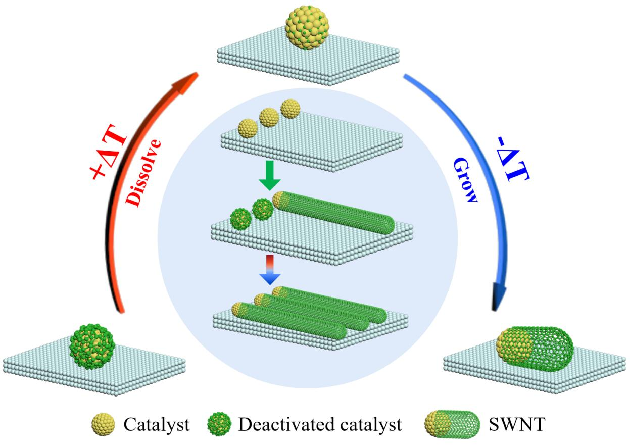图1. 用温度扰动法在石英基底上生长水平排列的SWNT阵列示意图。