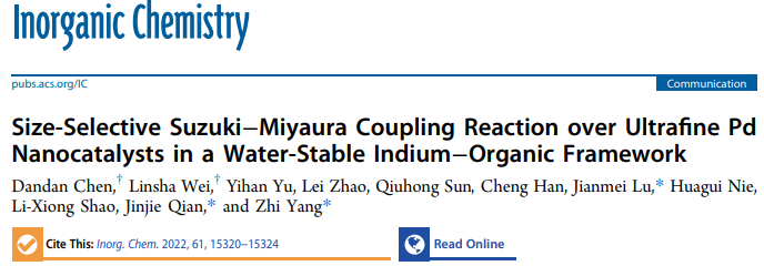 本研究工作为MOF基复合材料在多相催化中的广泛应用开辟了新的道路。近日,这一研究结果以“Size-Selective Suzuki-Miyaura Coupling Reaction over Ultrafine Pd Nanocatalysts in a Water-Stable Indium-Organic Framework”为题发表在《Inorganic Chemistry》,永利3044集团官网作为第一通讯单位,我院2020级硕士研究生陈丹丹和2019级硕士研究生魏琳莎为共同第一作者,永利陆建梅副教授、钱金杰副教授和杨植教授为共同通讯作者,该工作受到国家自然科学基金、浙江省自然科学基金、温州市基础科学研究项目、云南省地方本科高校基础研究联合专项重点项目等资助。