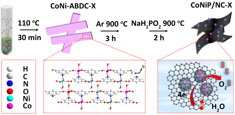 近日,永利钱金杰课题组以一系列Co/Ni基同构MOF(CoNi-ABDC)为前驱体,经过碳化及磷化处理后合成了双金属磷化物纳米颗粒锚定的氮掺杂碳纳米条复合材料CoNiP/NC-X,可将其作为高性能OER催化剂。所获得的CoNiP/NC-1纳米带具有良好的纳米结构、高比表面积、适量的杂原子掺杂、丰富的催化活性位点和高度石墨化的碳网络。因此,该材料在碱性溶液中表现出良好的准四电子OER性能,当电流密度为10 mA cm-2时,过电位为330 mV,Tafel斜率为80.5 mV dec-1,并在10 h稳定性测试后电流保持率为94.27%。