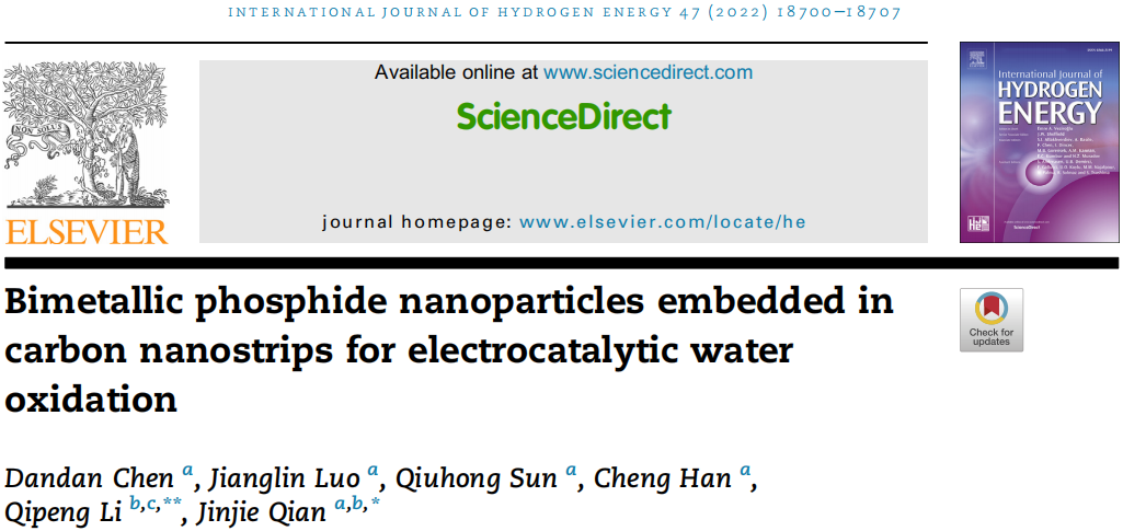 因此,本研究工作为高效电催化应用的双金属MOF衍生碳纳米材料的合理调控提供了一条全新的途径。近日,这一研究结果以“Bimetallic phosphide nanoparticles embedded in carbon nanostrips for electrocatalytic water oxidation”为题发表在《International Journal of Hydrogen Energy》,永利3044集团官网作为第一通讯单位,我院2020级硕士研究生陈丹丹为第一作者,永利钱金杰副教授和李启彭教授为共同通讯作者,该工作受到中国科学院结构化学国家重点实验室,国家自然科学基金等资助。
