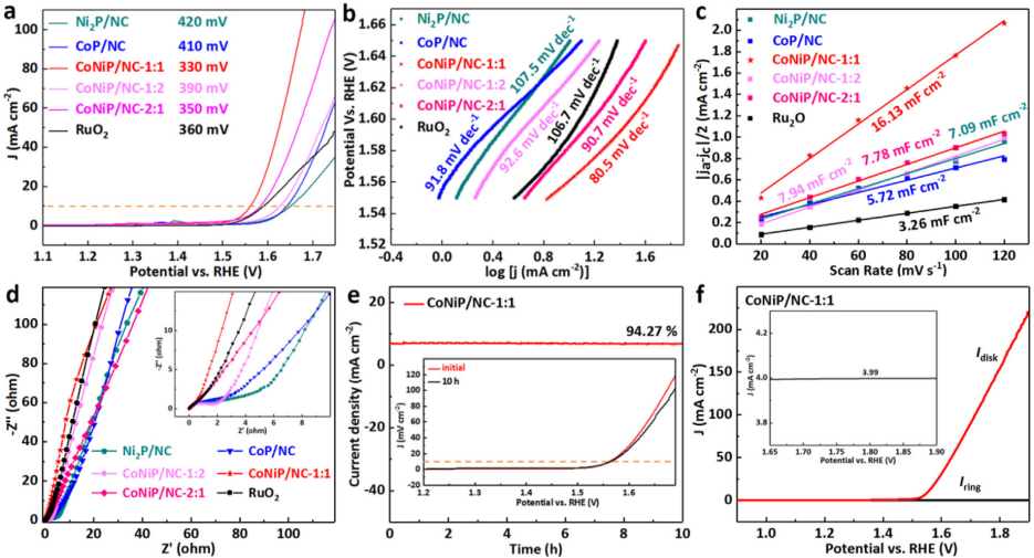 OER(Oxygen Evolution Reaction)被认为是太阳能水分解、可充电金属空气电池和燃料电池等可再生能源先进技术中最关键的阳极反应。由于其动力学缓慢,通常需要使用高活性催化剂来加快OER进程,从而提高此类器件的操作效率。目前,商用RuO2和IrO2由于其低过电位和高效率被认为是最佳的OER催化剂,但它们的储量低、成本高,极大的限制了其广泛应用。因此,迫切需要合理设计和制备经济、绿色、高效的非贵金属基电催化剂,在降低能垒的情况下提高电化学性能。