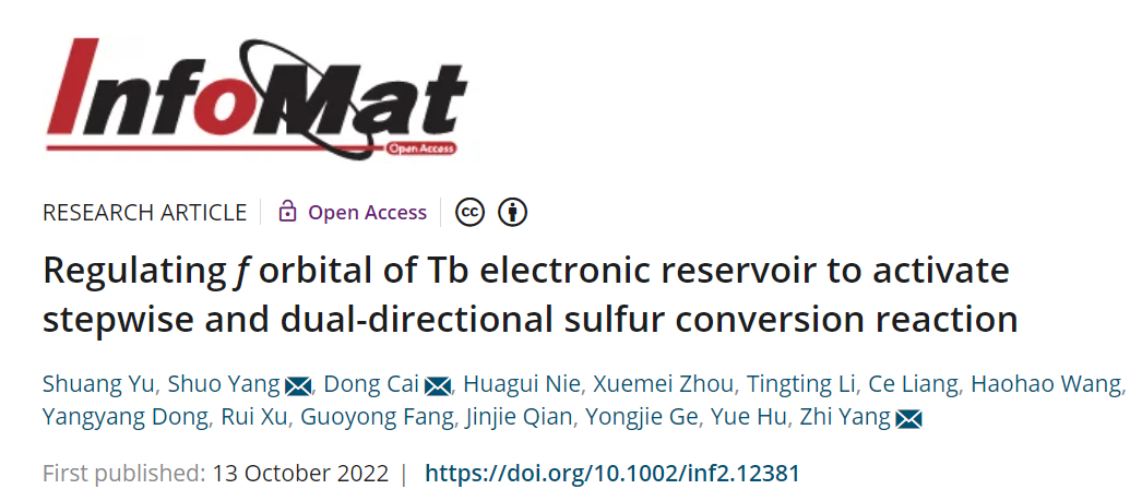 相关研究成果以“Regulating f orbital of Tb electronic reservoir to activate stepwise and dual-directional sulfur conversion reaction”为题发表在《InfoMat》(IF=24.789)上,永利3044集团官网为唯一通讯单位,我院2020级研究生于爽为第一作者,我院杨植教授、蔡冬博士以及电气与电子工程学院杨硕博士为该论文共同通讯作者,化材学院教师聂华贵、方国勇、钱金杰、胡悦、葛勇杰、肖逵逵、周学梅,研究生梁策、李婷婷、王浩浩、徐睿、东洋洋参与了这项工作。该工作受到国家自然科学基金、浙江省自然科学基金等项目的资助。