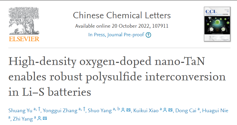 相关研究成果以“High-density oxygen-doped nano-TaN enables robust polysulfide interconversion in Li−S batteries”为题发表在《Chinese Chemical Letters》(IF=8.455)上,永利3044集团官网为唯一通讯单位,永利研究生于爽、张永贵为该论文共同第一作者,杨植教授与青年教师杨硕博士、肖逵逵博士为该论文共同通讯作者,永利教师聂华贵教授、蔡冬博士参与了这项工作。该工作受到国家自然科学基金(22109119,51972238,U21A2081),浙江省自然科学基金(LQ19B030006,LQ22B030003)等项目的资助。