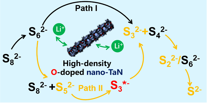 氮化钽(TaN)因其带隙窄、过电位低、化学稳定性高等优点,被广泛应用于氧还原等电催化反应。尽管TaN在锂硫电池中具有很高的催化硫氧化还原反应的潜力,但TaN在锂硫电池中的应用研究尚未见报道。为了解决锂硫电池中的穿梭效应和反应动力学迟缓的问题,永利杨植教授团队开发了一种多孔高密度氧掺杂氮化钽纳米结构(nano-TaNO)作为高效催化剂应用于锂硫电池中。nano-TaNO内部和表面都形成了均匀的纳米孔通道,具有储存更多的硫物种、易于电解液渗透和良好的电子/Li+传输等优点。更重要的是nano-TaNO中高密度O掺杂不仅提供了高导电性,还通过Li−O化学相互作用和激发S3*−自由基的生成促进了多硫化物的吸附/转化,开辟了从S8到Li2S新的转化路径。因此,即使在高硫负载条件下,nano-TaNO正极也表现出优异的比容量和可循环性。该项工作表明,氮化钽和大量阴离子掺杂工程在调控多硫化物中间体的形成和制造高性能锂硫电池方面具有巨大的潜力。
