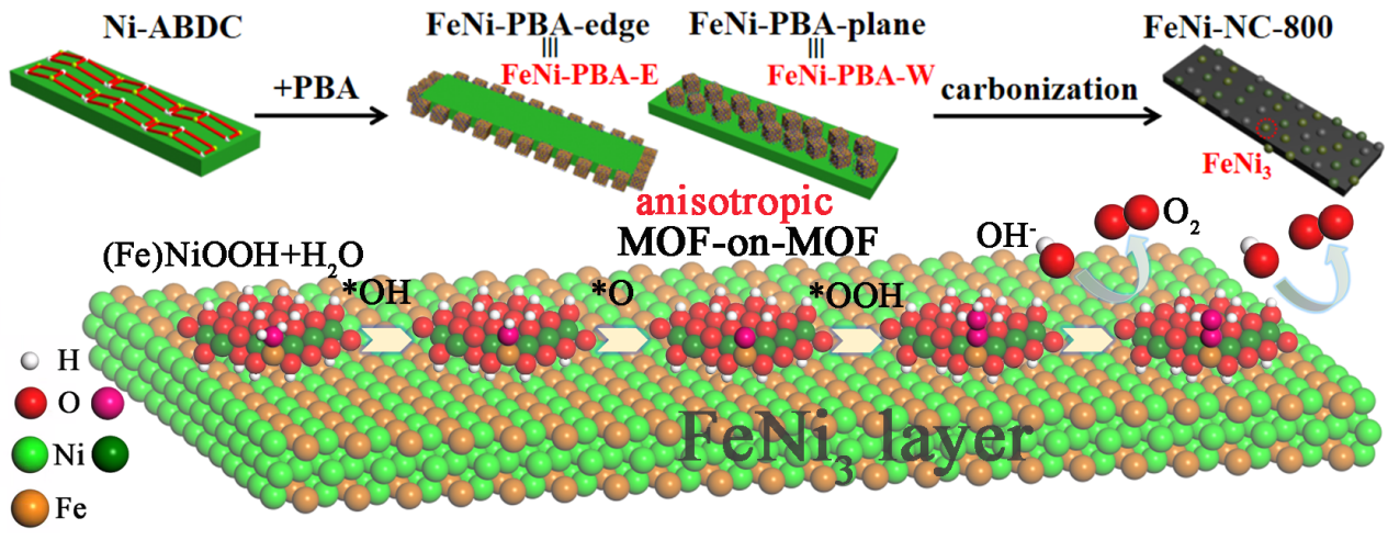 近日,永利3044集团官网钱金杰课题组通过调控溶剂的极性制备出新颖的MOF-on-MOF异质结构(FeNi-PBA)。此项工作以条状的Ni-ABDC为前驱体,在不同极性溶剂中加入铁氰化钾和Ni-ABDC。对于极性较高的溶剂(水和甲醇),PBA优先生长在Ni-ABDC前驱体的表面上;而对于极性较低的溶剂(乙醇和正丙醇),PBA将选择性地生长在Ni-ABDC的侧面,从而得到了两种类型的MOF-on-MOF异质结构(FeNi-PBA-plane和FeNi-PBA-edge)。经过高温碳化得到一系列MOF-on-MOF衍生碳纳米复合材料,并应用于析氧反应(OER)中。在电流密度达10 mA cm-2时,优化后的FeNi-NC-800催化剂表现出最低的过电位(281 mV)和最小的塔菲尔斜率(82 mV dec-1)。这种双金属-碳复合材料显示出比对照材料更好的OER活性和稳定性,可归因于其丰富的FeNi纳米颗粒、高氮含量、大比表面积以及FeNi原子之间的协同作用。此外,在确定OER过程中的活性组分为Ni基氢氧化物(NiOOH)后,相关的理论计算也进一步证明,在NiOOH中掺入Fe元素能够有效地提升材料的电催化OER性能。