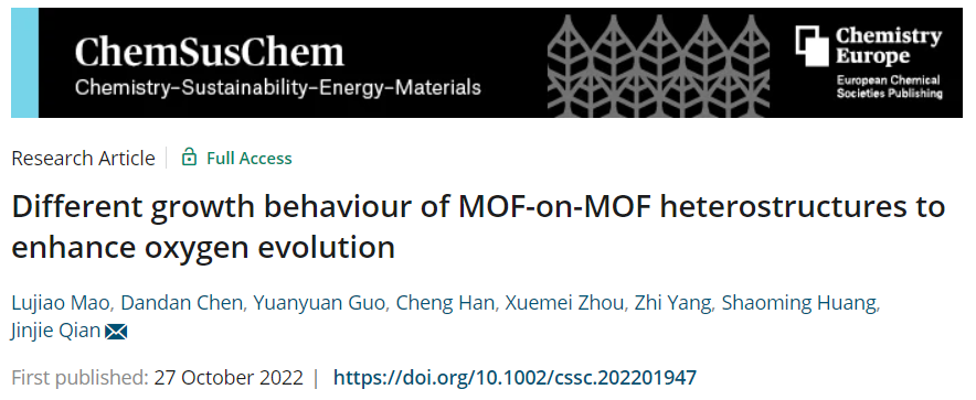 Mao, L., Chen, D., Guo, Y., Han, C., Zhou, X., Yang, Z., Huang, S. and Qian, J., Different growth behaviour of MOF-on-MOF heterostructures to enhance oxygen evolution. ChemSusChem. 2022, 10.1002/cssc.202201947.