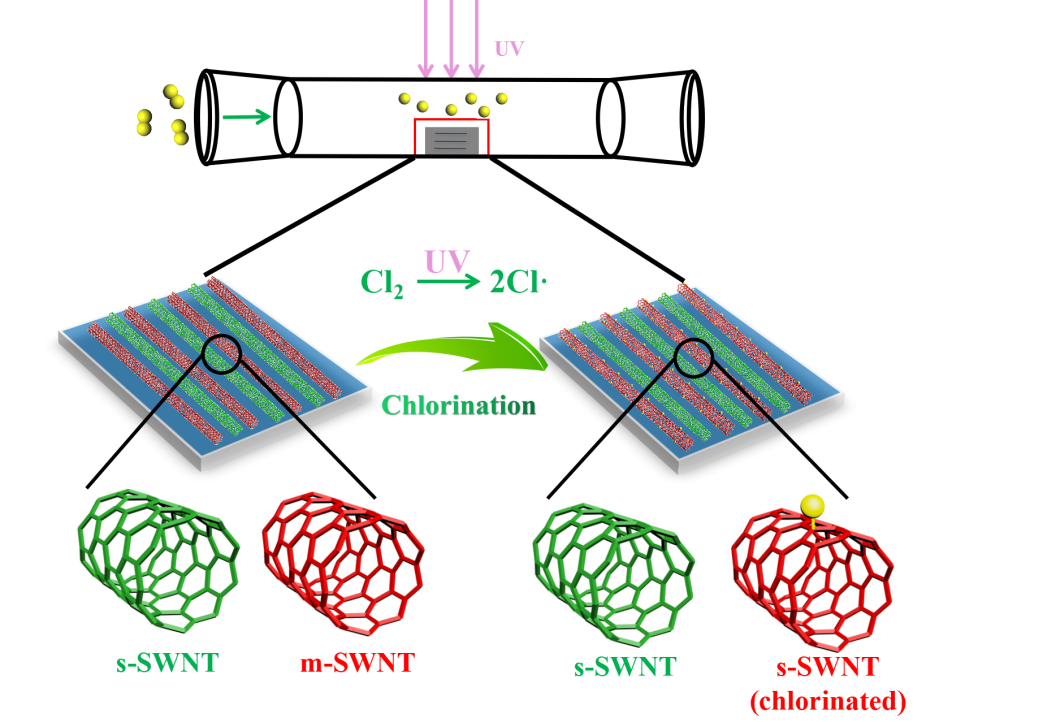 为解决上述问题,永利3044集团官网胡悦特聘教授团队联合广东工业大学黄少铭教授与吉林大学赵秋辰教授,提出了一种光氯化法制备半导体单壁材料碳纳米管及其分子内结。如图1所示,氯气在紫外线照射下分解得到氯自由基,可选择性地与金属性单壁碳纳米管共价结合,打开其带隙使其转变为半导体性单壁碳纳米管,最终使得整个单壁碳纳米管水平阵列呈现半导体性并在室温条件下可长期保持稳定性。