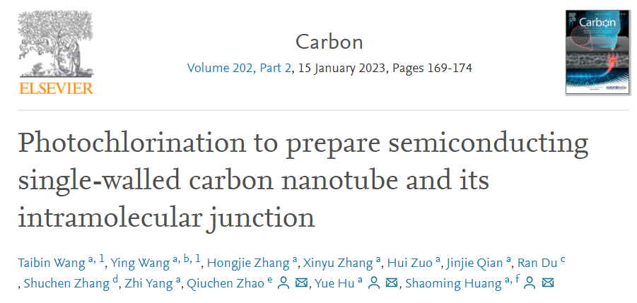 这一成果近期以“Photochlorination to prepare semiconducting single-walled carbon nanotube and its intramolecular junction”为题发表在国际期刊《Carbon》上,永利3044集团官网为第一通讯单位,永利3044集团官网永利3044集团官网研究生汪泰滨和王赢为文章的第一作者,永利胡悦特聘教授、广东工业大学黄少铭教授、吉林大学赵秋辰教授为通讯作者。