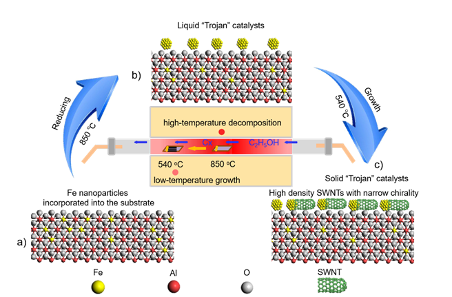 图1. 利用固体“特洛伊”催化剂在低温下生长高密度手性SWNTs的示意图。