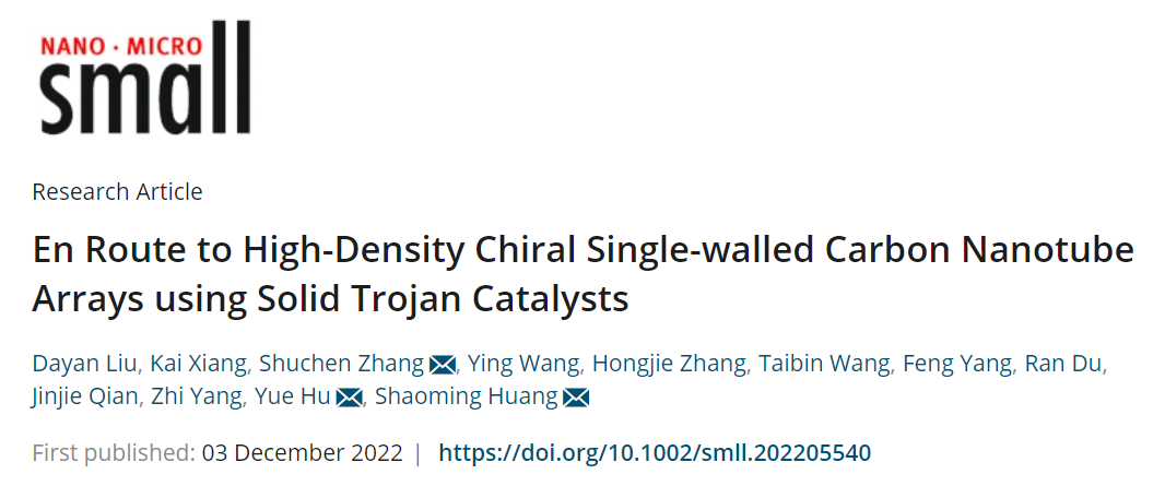 这一成果近期以“En Route to High-Density Chiral Single-walled Carbon Nanotube Arrays using Solid Trojan Catalysts”为题发表在国际期刊《Small》上,永利3044集团官网为第一通讯单位,永利3044集团官网永利3044集团官网研究生刘大燕为文章的第一作者,永利3044集团官网胡悦特聘教授、北京大学张树辰博士、广东工业大学黄少铭教授为通讯作者。