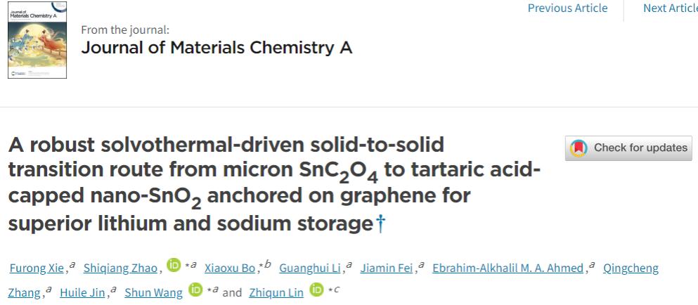 近日,国际能源期刊《Journal of Materials Chemistry A》在线刊登了永利赵世强副教授指导的研究论文“A Robust Solvothermal-Driven Solid-to-Solid Transition Route from Micron SnC2O4 to Tartaric Acid-Capped Nano SnO2 Anchored on Graphene for Superior Lithium and Sodium Storage”。