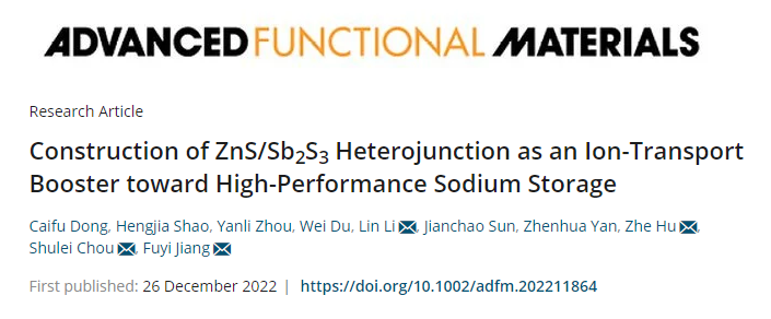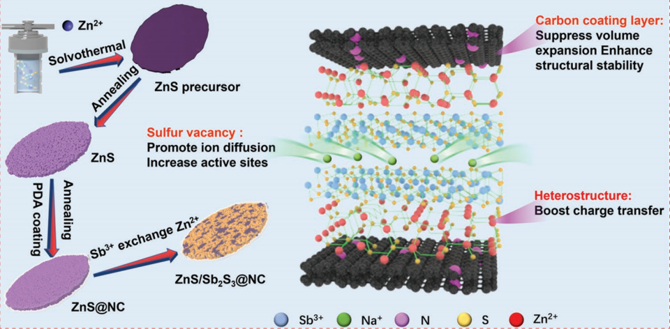 金属硫化物具有优异的氧化还原可逆性和较高的容量,在SIBs领域中具有广阔的应用前景。近日,永利碳中和技术创新研究院李林团队联合烟台大学和深圳大学在国际权威期刊Advanced Functional Materials上发表题为《Construction of ZnS/Sb2S3 Heterojunction as an Ion-Transport Booster toward High-Performance Sodium Storage》的学术论文。该工作通过阳离子交换法将Sb2S3引入ZnS中,合成了氮掺杂碳包覆的ZnS/Sb2S3 (ZnS/Sb2S3@NC)异质结结构。理论计算和实验研究表明ZnS/Sb2S3@NC异质结结构的构建有效的提升了电荷转移速率。因此,ZnS/Sb2S3@NC表现出优异的循环稳定性(循环450圈后可逆容量为511.4 mAh g-1)和倍率性能(在10 A g-1电流密度下的可逆容量为400.4 mAh g-1)。此外,通过X射线衍射和高分辨率透射电镜深入研究了ZnS/Sb2S3@NC的储钠机理。最后,组装了ZnS/Sb2S3@NC//Na3V2(PO4)3/ rGO全电池,其在循环50圈后仍具有226.2 mAh g−1的可逆容量。相关文章发表在Advanced Functional Materials上,永利侴术雷教授、李林特聘教授为该论文共同通讯作者,相关工作受到国家自然科学基金、浙江省自然科学基金、山东省自然科学基金和国家电网公司科技项目的资助。