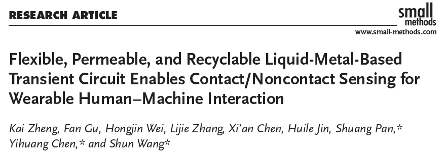 相关研究以“Flexible, permeable and recyclable liquid-metal-based transient circuit enables contact/non-contact sensing for wearable human-machine interaction”为题发表在国际期刊《Small Methods》(IF=15.367)上,永利3044集团官网作为唯一通讯单位,永利2020级硕士研究生郑凯为第一作者,永利陈亦皇教授、潘霜副教授、王舜教授为本文通讯作者。该工作得到张礼杰、陈锡安、金辉乐等老师的协助,并受到国家自然科学基金(No.62104170和22109120)、浙江省自然科学基金(LQ21B030002和LY23F04000)与浙江省高层次人才专项支持计划(2019R52042)等项目的支持。