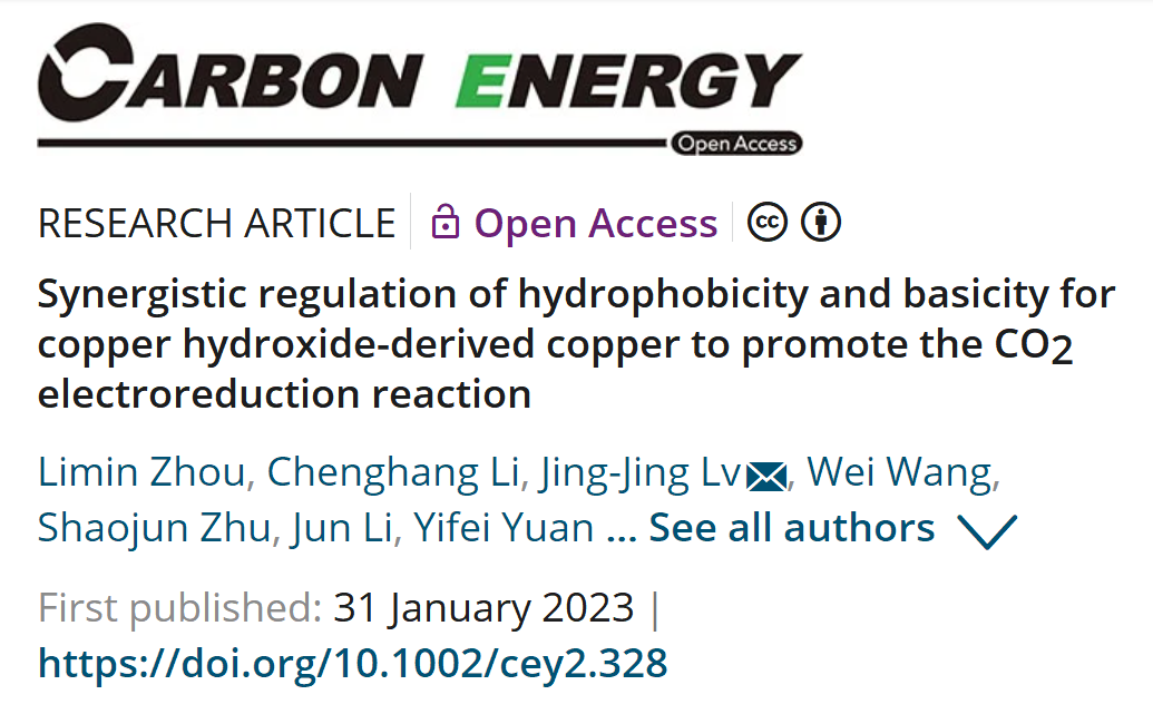 该成果以“Synergistic regulation of hydrophobicity and basicity for copper hydroxide‐derived copper to promote the CO2electroreduction reaction”为题发表在Carbon Energy期刊(IF=21.5,JCR一区)上。永利3044集团官网为唯一通讯单位,永利2020级硕士生周李敏为第一作者,永利吕晶晶教授、金辉乐研究员和王舜教授为共同通讯作者。感谢袁一斐教授课题组为本工作中高清TEM和Mapping表征提供技术支持。