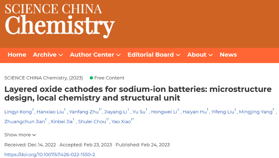 该成果以“Layered oxidecathodes for sodium-ion batteries: microstructure design, local chemistry and structural unit”为题发表在国内旗舰期刊Science China Chemistry上(IF:10.138,在JCR和《中科院期刊分区表》1区)。永利3044集团官网作为第一通讯单位,永利2022级硕士研究生孔令益和刘含笑为本文共同第一作者。永利肖遥/侴术雷/朱燕芳教授为本文的通讯作者。