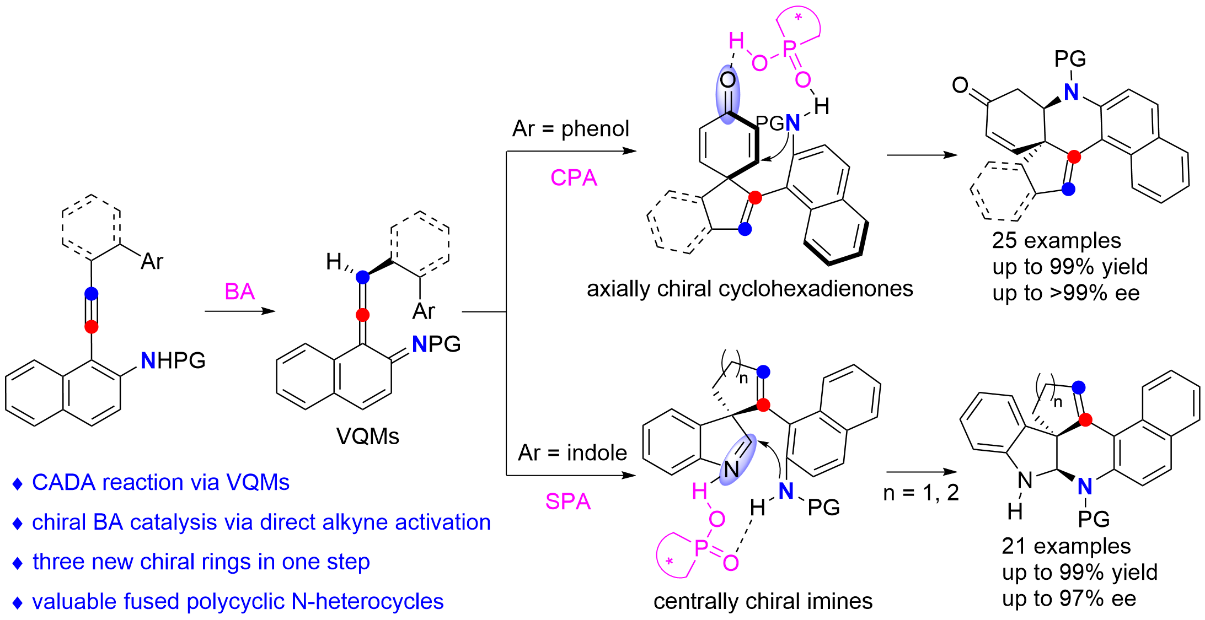 近些年来,通过活化惰性炔烃来实现炔烃催化不对称官能团化反应一直受到人们的广泛关注。与成熟的过渡金属催化这些转化相比,基于惰性炔烃活化的不对称有机催化发展相对较少。近日,永利钱鹏程教授课题组与厦门大学叶龙武教授课题组合作以简单易得的苯酚高炔丙胺和吲哚高炔丙胺为底物,实现了Brønsted酸直接活化炔烃并成功完成苯酚和吲哚催化不对称去芳构化反应。该反应具有如下特点:(1)实现了Brønsted酸直接活化炔烃;(2)报道了无金属参与的基于苯酚和吲哚的不对称去芳构化反应;(3)一步构建具有季碳且多立体中心的含氮杂环;(4)具有优秀的化学选择性、对映选择性和立体选择性。