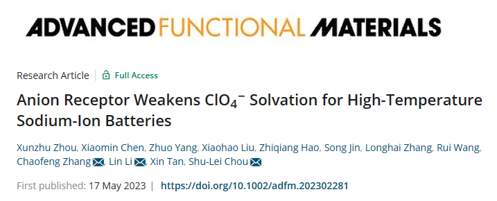 可充电池对季节性和日常工作温度波动的温度耐受性极大影响其稳定性和安全性。然而,高温会加剧电解液的持续性分解,生成不稳定的正极-电解液界面膜(CEI),导致电池容量的快速衰减。近日,永利碳中和技术创新研究院李林团队联合安徽大学在国际权威期刊《Advanced Functional Materials》上发表题为《Anion Receptor Weakens ClO4–Solvation for High-Temperature Sodium-Ion Batteries》的学术论文。该工作引入了阴离子受体三(五氟苯基)硼烷(TPFPB)作为电解液添加剂,通过构建稳固且富含NaF的CEI膜提升电池的高温循环稳定性。密度函数理论(DFT)证明TPFPB和ClO4−阴离子之间通过B-O键表现出强相互作用,体现为两方面优势:其一,高氟化末端的TPFPB添加剂通过ClO4−阴离子参与中心Na+的溶剂化构型配位,并优先分解生成稳固且富含NaF的CEI膜;其二,削弱了ClO4−的溶剂化作用,促进溶剂与Na+阳离子的配位能力,显著提高电解液的氧化稳定性。所构筑的电解液在磷酸钒钠正极中,在4.2V的高截止电压(vs. Na+/Na)和60℃的高温条件下,100次循环后容量保持率达86.9%,并在-30至60°C的宽温域范围内展现出优异的高压稳定性及倍率性能。相关文章发表在国际著名期刊Advanced Functional Materials上,永利侴术雷教授、李林特聘教授为该论文共同通讯作者,相关工作受到国家自然科学基金、安徽省自然科学基金、浙江省自然科学基金、国家电网科技计划等项目的支持。