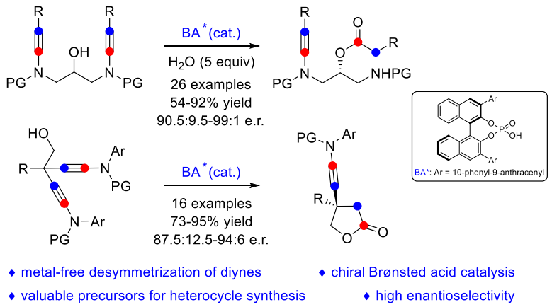 近些年来,通过活化炔酰胺来实现催化不对称官能团化反应一直受到科学家们的广泛关注。与发展成熟的过渡金属催化相比,基于炔酰胺的不对称有机催化发展相对较少。近日,永利钱鹏程教授课题组与厦门大学叶龙武教授课题组合作以简单易得的炔酰胺为底物,实现了手性Brønsted酸催化的去对称化反应。该反应具有如下特点:(1)首例手性Brønsted酸催化二炔的去对称化反应;(2)宽广的底物普适性(适用于1,4-和1,8-二炔);(3)优异的对映选择性。