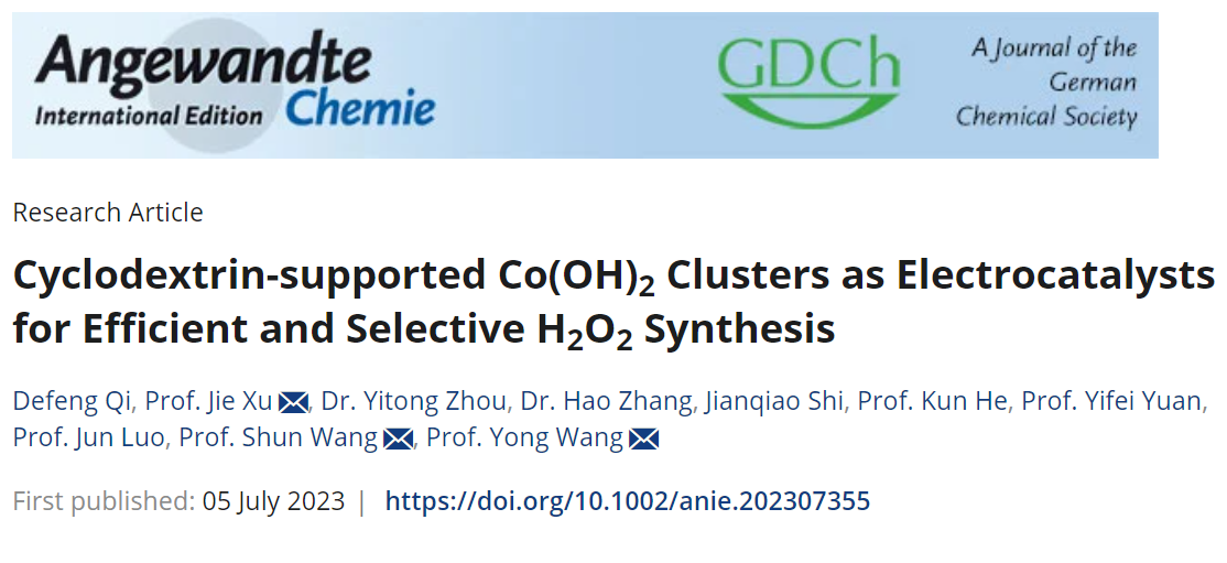 该研究以“Cyclodextrin-supported Co(OH)2 Clusters as Electrocatalysts for Efficient and Selective H2O2 Synthesis”为题发表在国际著名学术期刊《Angewandte Chemie International Edition》。永利王舜教授、许杰特聘教授以及天津大学王勇教授为该论文共同通讯作者,相关工作受到国家自然科学基金、江苏省自然科学基金的资助。