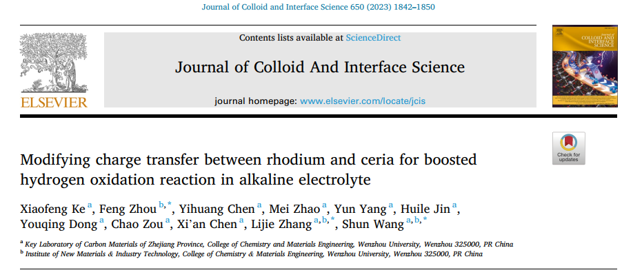 这项研究的成果《Modifying charge transfer between rhodium and ceria for boosted hydrogen oxidation reaction in alkaline electrolyte》发表在《Journal of Colloid and Interface Science》(中科院1区,Top,IF = 9.9)上,永利3044集团官网为第一通讯单位,永利2020级研究生柯小凤为第一作者,张礼杰研究员为通讯作者、王舜教授、周峰博士为共同通讯作者。该研究得到了国家自然科学基金(52072272、52171145和22109120)、浙江省自然科学基金(LQ21B030002)、浙江省高层次人才专项支持计划(2019R52042)和温州市科技创新重点项目(ZG2022037)的支持。