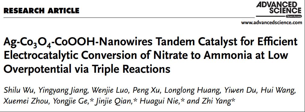 相关研究成果以《Ag-Co3O4-CoOOH-Nanowires Tandem Catalyst for Efficient Electrocatalytic Conversion of Nitrate to Ammonia at Low Overpotential via Triple Reactions》为题发表在国际著名期刊《Advanced Science》上,永利3044集团官网为第一单位,永利3044集团官网2021级研究生吴世路为第一作者,永利杨植教授、聂华贵教授、葛勇杰博士和钱金杰副教授为共同通讯作者。永利周学梅博士,研究生罗文杰,江颖洋,许鹏,黄隆隆,杜艺文,王慧参与了该项工作。上述工作得到了国家自然科学基金的支持。