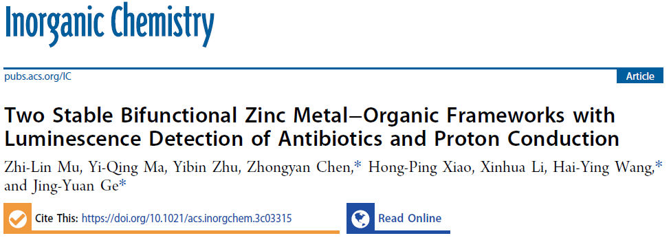 相关研究成果以“Two Stable Bifunctional Zinc Metal-Organic Frameworks with Luminescence Detection of Antibiotics and Proton Conduction”为题,近日发表在《Inorganic Chemistry》期刊上,永利3044集团官网作为第一通讯单位,永利2021级硕士研究生穆志林为第一作者,陈忠研博士、王海英副研究员和葛景园博士为共同通讯作者。该工作受到浙江省基金项目(LQ21B050001),国家自然科学基金(21801054和21801127)和温州基础基金科研项目(Y20210265)项目的资助。