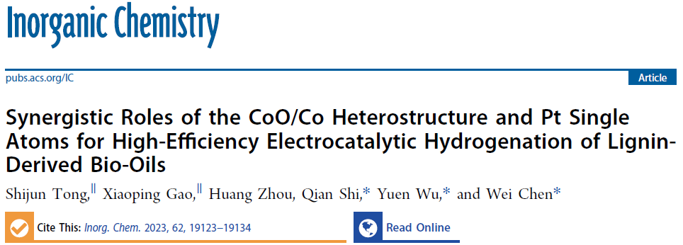 永利陈伟、时茜教授课题组和中国科学技术大学吴宇恩教授课题组在国际期刊《Inorganic chemistry》发表题为“Synergistic Roles of the CoO/Co Heterostructure and Pt Single Atoms for High-Efficiency Electrocatalytic Hydrogenation of Lignin-Derived Bio-Oils”的论文。该工作通过简单的电化学沉积的方法在CoO/Co异质结构上引入Pt单原子,通过单原子与载体之间独特的协同作用,优化了反应物、中间体和产物在催化活性中心上的吸附行为,从而显示出对苯酚ECH的高催化活性。一方面,由于自由电子从相邻的Co金属转移到Pt单原子位点附近,质子被还原并吸附在单原子Pt位点。另一方面,苯酚以平行构型吸附活化在CoO上。然后,单原子Pt周围的金属Co原子起到了关键的“桥梁”作用,将活化的H物种通过氢溢流转移到吸附的苯酚物种,最终生成KA油。