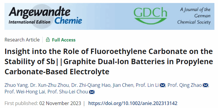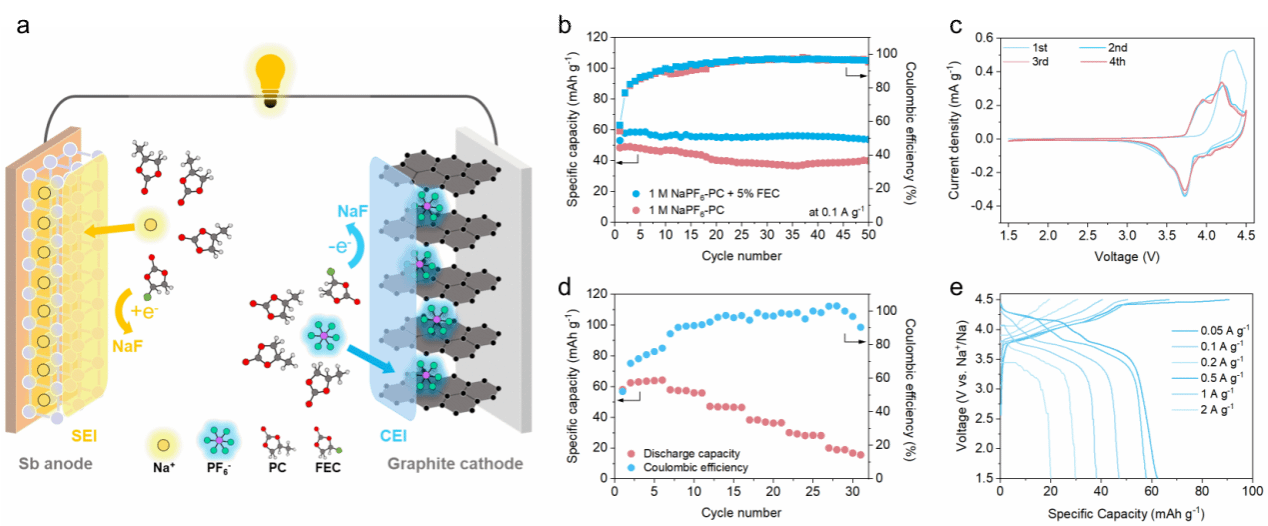 近日永利碳中和技术创新研究院李林团队联合南开大学赵庆教授以及澳大利亚伍仑贡大学赖伟鸿教授在国际权威期刊《Angewandte Chemie International Edition》上发表题为《Insight into the Role of Fluoroethylene Carbonate on the Stability of Sb||Graphite Dual-Ion Batteries in Propylene Carbonate-Based Electrolyte》的学术论文。本论文以锑(Sb)和石墨分别作为阳极和阴极,研究了含有氟代碳酸乙烯酯(FEC)添加剂的电解液中Na- DIBs的电化学性能。与不含FEC的电解液(1 M NaPF6-碳酸丙烯酯(PC))相比,作者发现加入FEC添加剂(5 wt.%)可促进阴极和阳极上富含NaF的无机电极电解质界面的形成,并改变PF6-阴离子的溶剂化行为。这种改性不仅有效抑制了NaPF6盐和PC溶剂的过度分解,还促进了PF6-阴离子在石墨阴极中的插层。制备的Sb||石墨全电池在50次循环后达到了58.5 mAh g-1的高放电比容量,容量保留率为93.1%(而传统电解质分别为48.3 mAh g-1和79.7%)。此外,在功率密度为157.78 W kg-1时,电池的能量密度为194.95 Wh kg-1(基于正极和负极的活性材料的质量)。本工作阐明了双功能FEC的潜在机制,并为构建高性能双离子电池提供了一种替代策略,促进了他们在未来可持续储能系统中的实际应用。