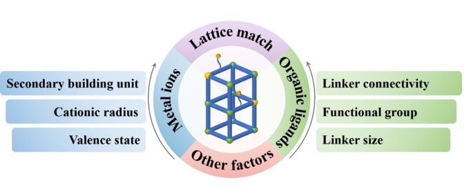 由于MOF-on-MOF复合材料结构的多样性和界面的复杂性,合理设计与简便合成MOF-on-MOF复合材料具有挑战性。因此,本综述论文主要阐述了影响其界面生长的因素。通过在异相反应中合理设计来调节MOF的界面生长,可以获得不同结构和形貌的材料。本文主要围绕金属离子和有机配体对MOF-on-MOF结构界面生长的影响进行解读,并着重讨论了晶格匹配、动力学、热力学等因素。异相生长过程首先将初级MOF分散到合适的溶剂中,然后引入外部金属离子或外加有机配体诱导MOF-on-MOF的生长。无机金属离子可以参与多相配位聚合物的组装。在异相反应中,通过控制金属类型、离子半径、氧化态和配位数等因素在MOF晶种上外延生长二次MOF,从而形成多功能MOF-on-MOF材料。当桥联配体具有不同的官能团时,它们表现出相似的结构和一致的拓扑结构,导致各向同性的生长;当桥联配体具有不同尺寸时,二次MOF将沿特定方向生长。