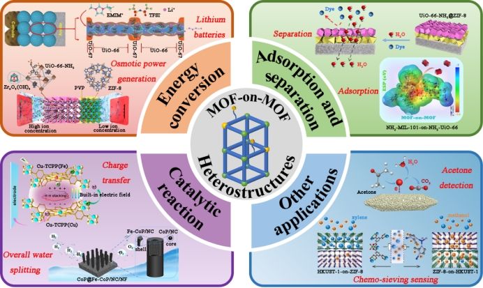 金属有机框架(Metal-Organic Framework,MOF)作为多孔性晶体材料的一个重要子类,以其独特的结构和多功能特性在各个研究领域都扮演着举足轻重的角色。近年来,基于MOF的复合材料,尤其是MOF-on-MOF异质结构的研究引起了广泛关注。与单一MOF材料相比,MOF-on-MOF结构充分利用了两个或多个不同MOF的独特属性,实现了协同效应。这种结构不仅允许为不同的多层结构定制设计,以拓宽其应用范围,而且在材料性能方面展现了新的可能性。然而,当前对MOF-on-MOF材料的研究主要集中在其形貌和应用方面,对于控制MOF-on-MOF异质结构界面生长行为的机制讨论相对较少。在这一背景下,我们深入研究了MOF-on-MOF界面生长的复杂细节,同时考虑了内在和外在因素。通过全面的探索,我们旨在为扩大MOF-on-MOF种类提供新的研究见解。这有望推动该领域的发展,为设计更高效、多功能的MOF-on-MOF材料奠定基础。