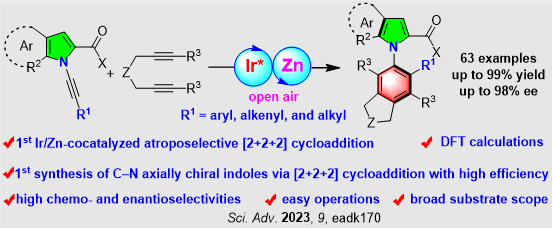 论文链接:Ir/Zn-cocatalyzed chemo- and atroposelective [2+2+2] cycloaddition for construction of C−N axially chiral indoles and pyrroles. Jian Yang1#, Zhong-Yang Xie1#, Yu-Jie Ye1, Sheng-Bing Ye1, Yi-Bo Wang1, Wen-Tao Wang1, Peng-Cheng Qian*1,4, Ren-Jie Song2, Qing Sun*2, Long-Wu Ye3, and Long Li*1,3,4 Sci. Adv. 2023, 9, eadk170. DOI: 10.1126/sciadv.adk1704.