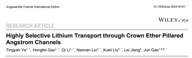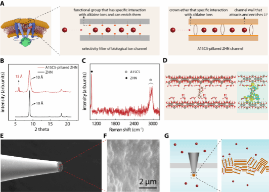 生物离子通道可以将目标离子与竞争离子高选择性分离,它们的分离性能仍是人工材料无法企及的。然而,我们可以从中获得启示用于提升人工材料的性能,并应用于能源和环境领域。例如,随着电动汽车产业的快速发展,锂的需求急剧增加,盐湖提锂、海水提锂受到越来越多的关注。从盐湖或海水中提锂的材料必须具有极高Li+/Mg2+或Li+/Na+选择性,而这正是当前分离材料领域的重大挑战。生物离子通道实现高选择性分离的机制是多维度的。这些通道具有埃级尺寸,可以适配目标离子并排斥较大的离子;另外,通道表面具有丰富的基团与目标离子发生特异性识别;其次,通道表面的基团可以强烈吸引并富集目标离子,这种富集作用可以显著增强目标离子电导。利用以上机制的协同效应,生物离子通道可以在排斥竞争离子的同时增强目标离子传输,从而显著放大选择性。受生物启发,近日永利化材学院刘楠楠特聘教授课题组构筑了埃级尺寸的冠醚柱撑通道,即1-氮杂-15-冠-5插层的碱式硝酸锌(A15C5-pillared ZHN),将以上效应集成到材料中,实现了高选择性锂离子传输。其中,通道的埃级尺寸可以排斥双价离子,而冠醚对碱金属离子有特异性识别功能,可以促进锂的传输,阻碍钠的传输,另外,所构筑的通道与锂离子相互作用强,可以高效富集锂离子,最高可将锂离子电导提升多个数量级。为了评估材料提锂的潜力,刘楠楠特聘教授团队制备了含不同浓度LiCl (25 μM至0.5 M)和固定浓度NaCl(0.5 M)的二元离子混合物,将提锂装置置于离子混合物和超纯水之间,使离子沿浓度梯度扩散(图2F)。在锂离子浓度与海水中相近(25 μM)时,材料可以放大锂离子电导,有效Li+/Na+选择性高达1422。这些结果表明离子富集对提高Li+选择性的重要性。上述成果以“Highly Selective Lithium Transport through Crown Ether Pillared Angstrom Selective Lithium Transport through Crown Ether Pillared Angstrom Channels”为题发表在国际顶级期刊《Angew. Chem. Int. Ed.》上。