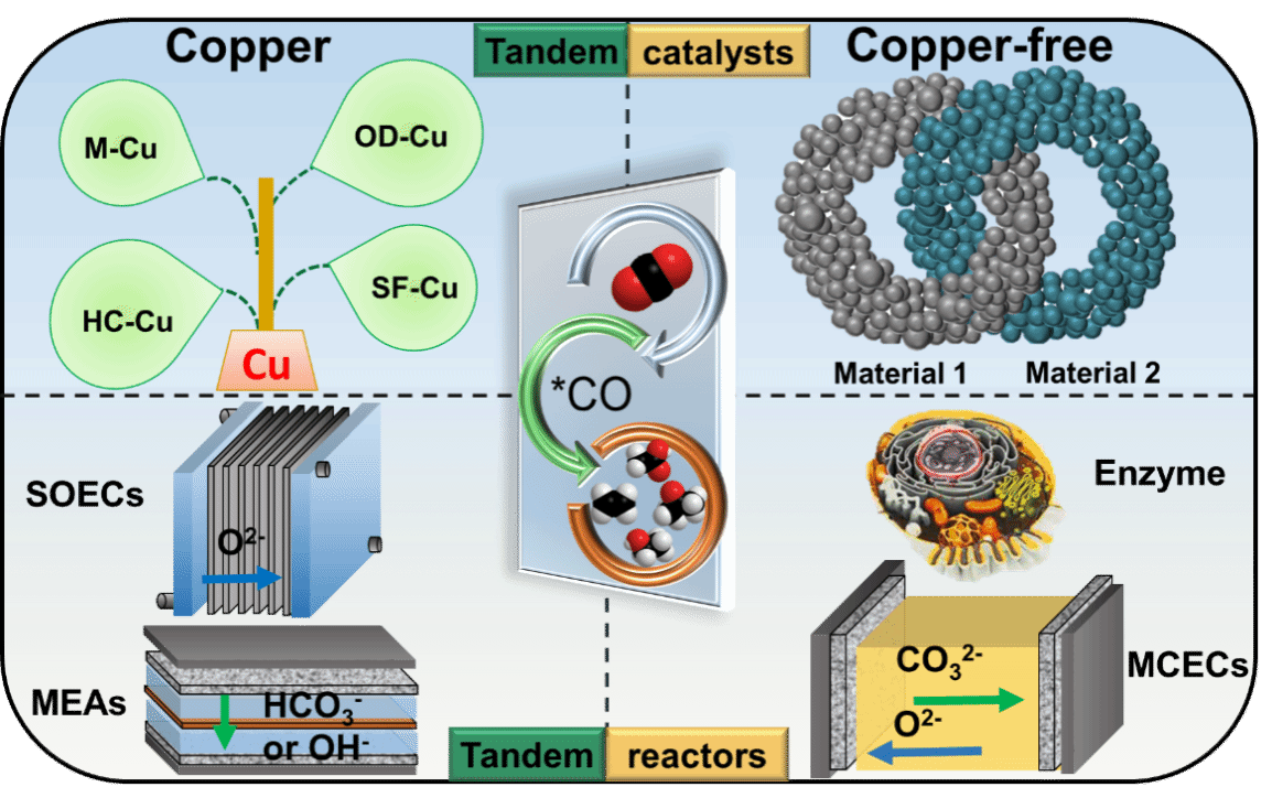 尽管串联eCO2RR已经得到了广泛的研究,但由于对催化剂设计和串联反应器与其催化性能之间关系的了解有限,严重阻碍了其发展。本综述总结了近年来优秀的串联催化剂开发策略,包括有调节铜基催化剂的金属组成、氧化态、表面功能化或无铜复合材料(图1)。对于串联反应器,eCO2RR主要与电化学反应器、热化学反应器和生物反应器等相结合。虽然在过去的三十年里,科学界已经抓住了一些关于eCO2RR串联催化的关键基础理论、科学和技术,但eCO2RR在工业生产中的实际应用还有很长的路要走。