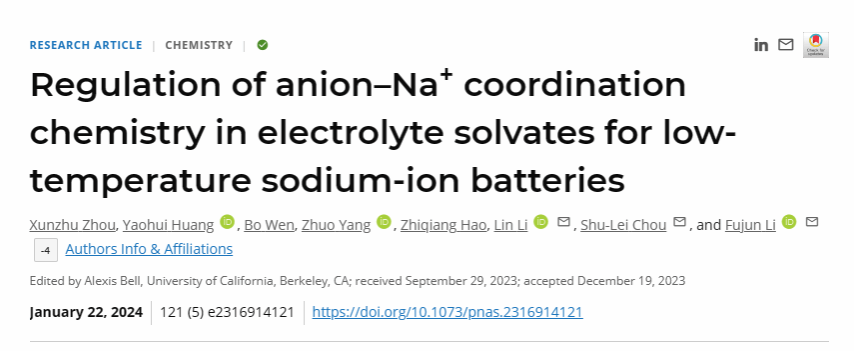 近日永利碳中和技术创新研究院李林团队联合南开大学李福军教授在国际权威期刊Proceedings of the National Academy of Sciences of the United States of America上发表题为“Regulation of Anion-Na+ Coordination Chemistry in Electrolyte Solvates for Low Temperature Sodium-Ion Batteries”的学术论文。文中选用高电子亲和能力的阴离子三氟乙酸根(TFA-)调控1.0 M NaPF6-G2电解液中的溶剂化学。该全氟阴离子的DN值高达34.0 kcal mol-1,其强配位作用使其全部参与内溶剂化鞘层,实现常规浓度下更多阴离子占据的溶剂化构型。与1.0 M NaPF6-G2电解液相比,增强的TFA-和降低的G2配位的溶剂化化学加速了界面Na+去溶剂化行为,呈现出较低的去溶剂化能(40至-20 ℃:3.49 vs. 4.16 kJ mol-1;-20至-60 ℃:16.55 vs. 24.74 kJ mol-1)。可诱导均匀稳定的Na沉积,实现25 ℃下500圈99.9%的超高超稳定的库仑效率。同时,Na||Na3V2(PO4)3电池在-40 ℃下循环呈现出60.2%的室温容量和100圈后99.2%的高容量保持率。这项工作为溶剂化化学调控助力高性能低温钠离子电池发展提供了新的见解。永利博士后周洵竹为第一作者,永利侴术雷教授,李林特聘教授以及南开大学李福军教授为共同通讯作者,相关工作受到国家自然科学基金,中国博士后科学基金及海河可持续化学转化实验室的资助。
