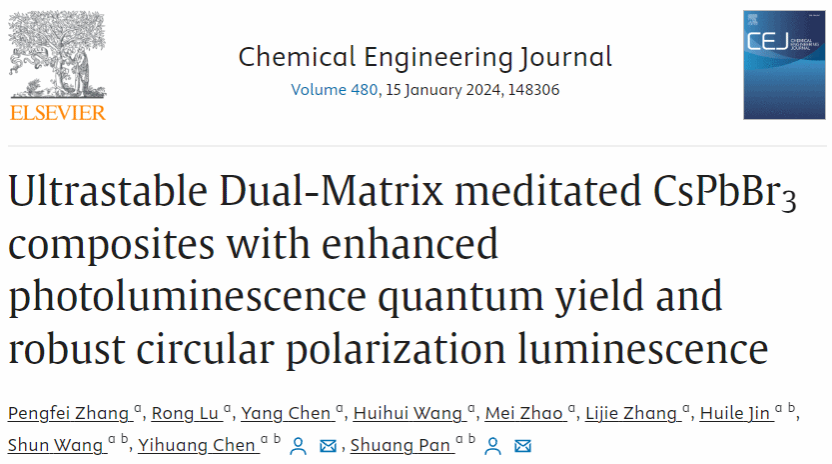 该成果以“Ultrastable Dual-Matrix meditated CsPbBr3 composites with enhanced photoluminescence quantum yield and robust circular polarization luminescence”为题发表在Chemical Engineering Journal期刊(IF=15.1,SCI一区)上。永利3044集团官网为唯一通讯单位,生环学院2021级研究生张鹏飞为第一作者,永利陈亦皇教授、潘霜副教授为共同通讯作者。