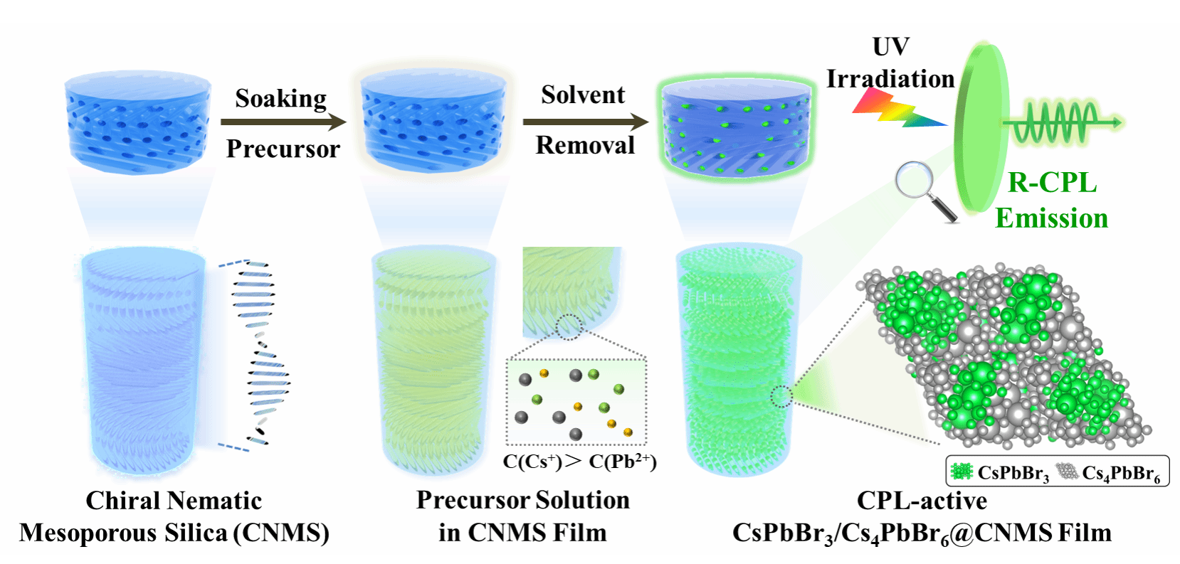 本工作提出了利用手性向列介孔二氧化硅(CNMS)和无机Cs4PbBr6层双基质封装制备CPL活性无机纳米复合材料的前沿策略(图1)。使用独立的CNMS硬模板为全无机CsPbBr3钙钛矿纳米晶体(PNCs)提供了一个有限的生长环境,使非圆偏振发光转化为CPL。另外,无机Cs4PbBr6层的有效钝化,使该体系获得了优越的光学性能和稳定性。合成的CsPbBr3/Cs4PbBr6@CNMS复合膜的品质因子(FM)值达到−7.8×10−2,超过了目前先进系统的性能。此外,表面钝化和双矩阵封装提供的保护,增强了复合材料在恶劣环境下的稳定性,具有稳健的性能。将该CPL材料成功地集成到圆偏振发光二极管器件中,证实了其在CPL显示器和发光器件中的适用性。为开发高性能CPL材料和应用建立了可靠有效的方法。