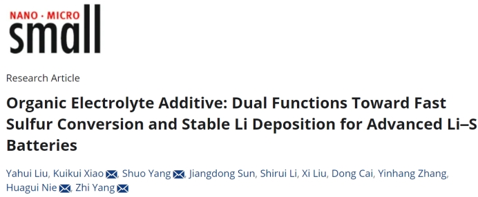 该研究以“Organic Electrolyte Additive: Dual Functions toward Fast Sulfur Conversion and Stable Li Deposition for Advanced Li–S Batteries”为题发表在国际顶级学术期刊《Small》。永利3044集团官网为唯一通讯单位,永利肖逵逵博士,杨硕副教授,聂华贵教授和杨植教授为共同通讯作者,化材学院21级硕士研究生刘雅慧为第一作者,相关工作受到国家自然科学基金(22309135、22109119、51972238、U21A2081)、浙江省自然科学基金(LQ22B030003)、温州市重大科技创新项目(ZG2021013)等项目的资助。