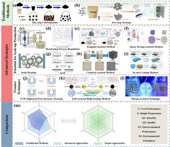 到目前为止,大多数研究主要集中在传统的硬碳材料制备方法上,包括调节温度和加热速率等,可以称为固有“舒适区”。近日,永利碳中和技术创新研究院吴星樵博士团队将目前报道的实验室先进合成硬碳材料的方法进行了综述,包括具有规模化潜力和更偏向理论指导意义的两种,与传统方法(目前的规模化制备方法)进行对比,从预处理、高温碳化以及后处理的角度介绍了提升硬碳材料性能/能量利用效率的先进方法,并对硬碳负极材料实验室制备到实现商业化应用进行了展望。